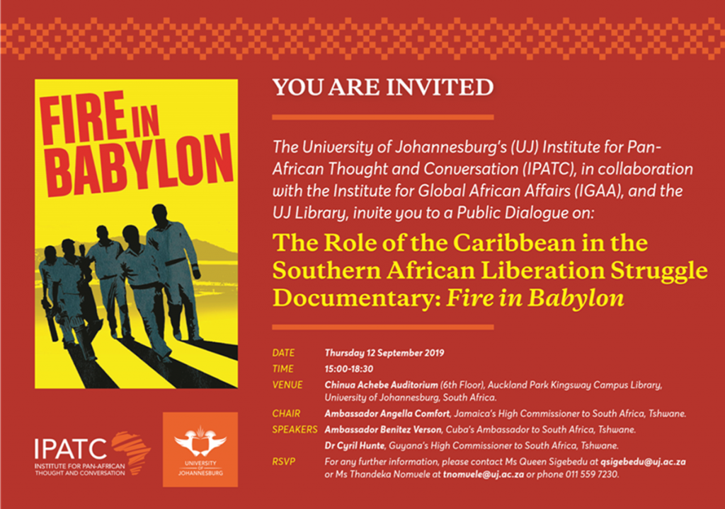 The University of Johannesburg’s (UJ) Institute for Pan-African Thought and Conversation, in collaboration with the UJ Library, held a Public Dialogue titled “The Role of the Caribbean in the Southern African Liberation Struggle” on Thursday 12 September 2019. The event included screening of the documentary Fire in Babylon and it was attended by 101 guests.