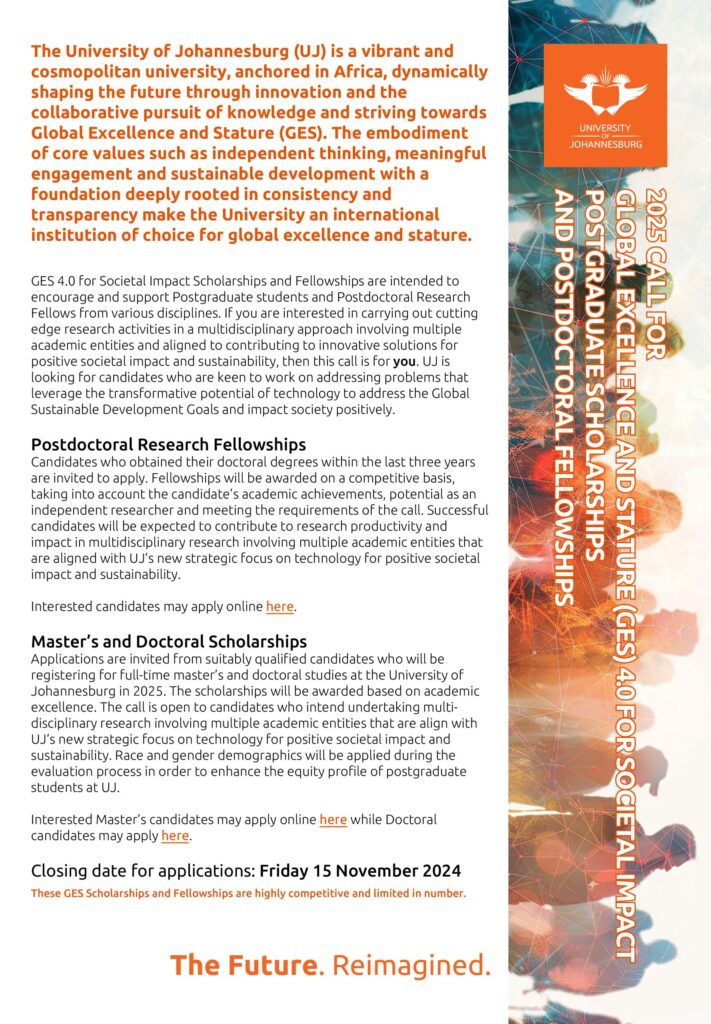 Call for Applications – UJ GES 4.0 Postdoctoral Research Fellowships Overview: The University of Johannesburg (UJ) GES 4.0 for Societal